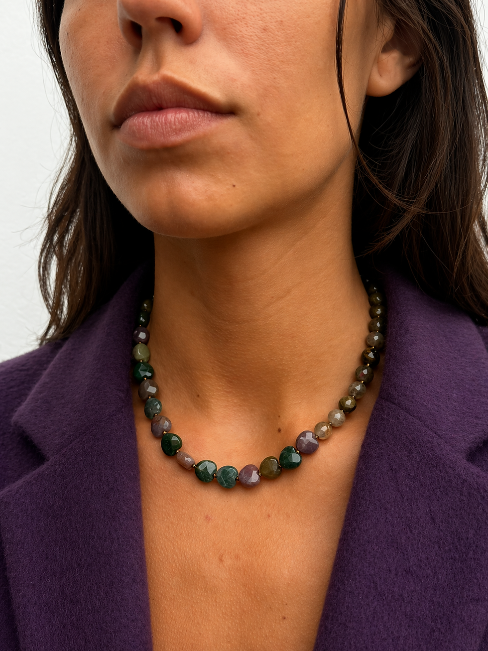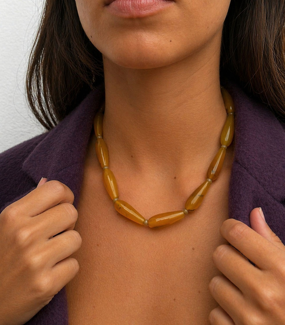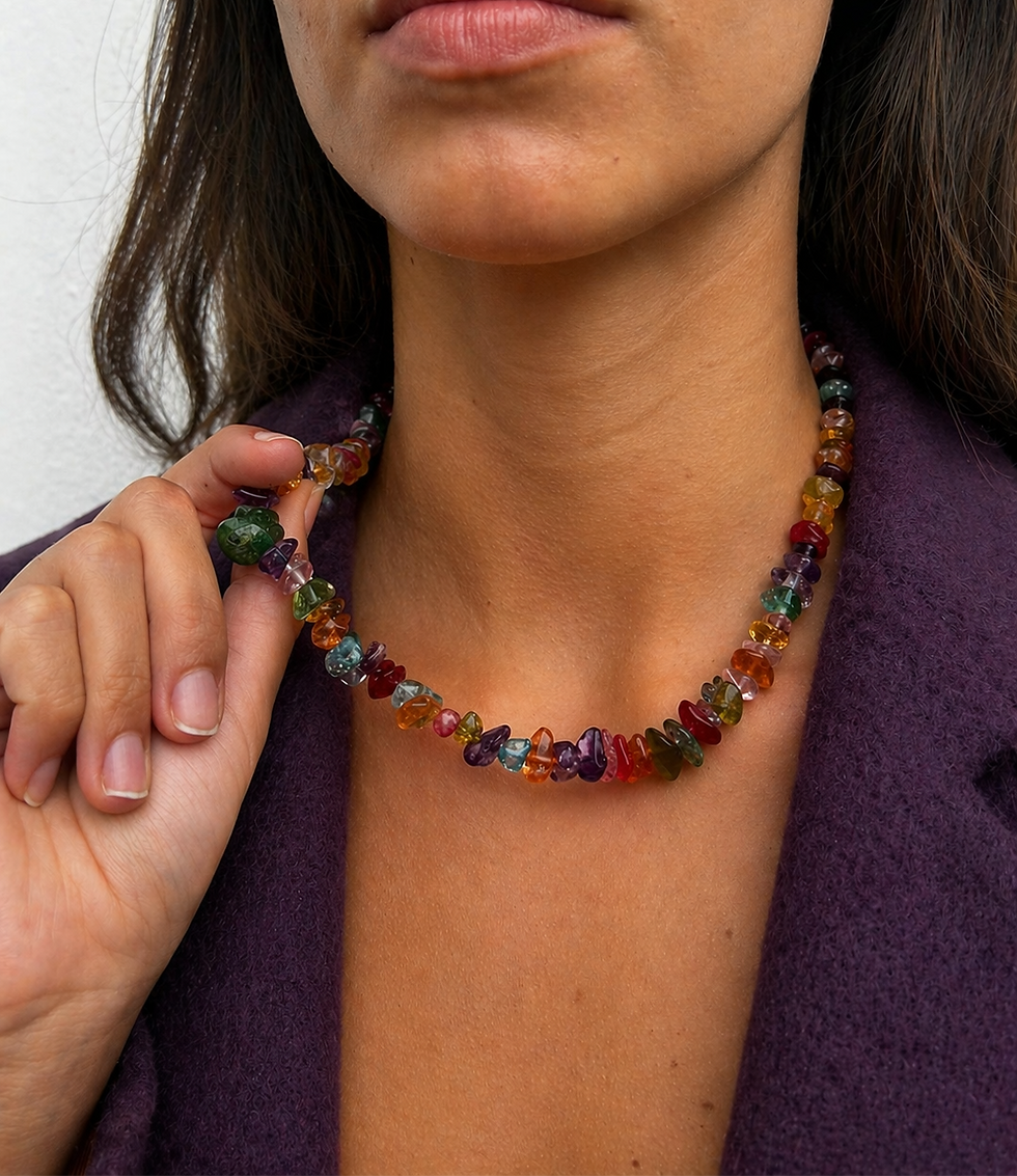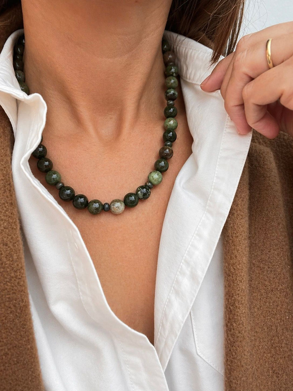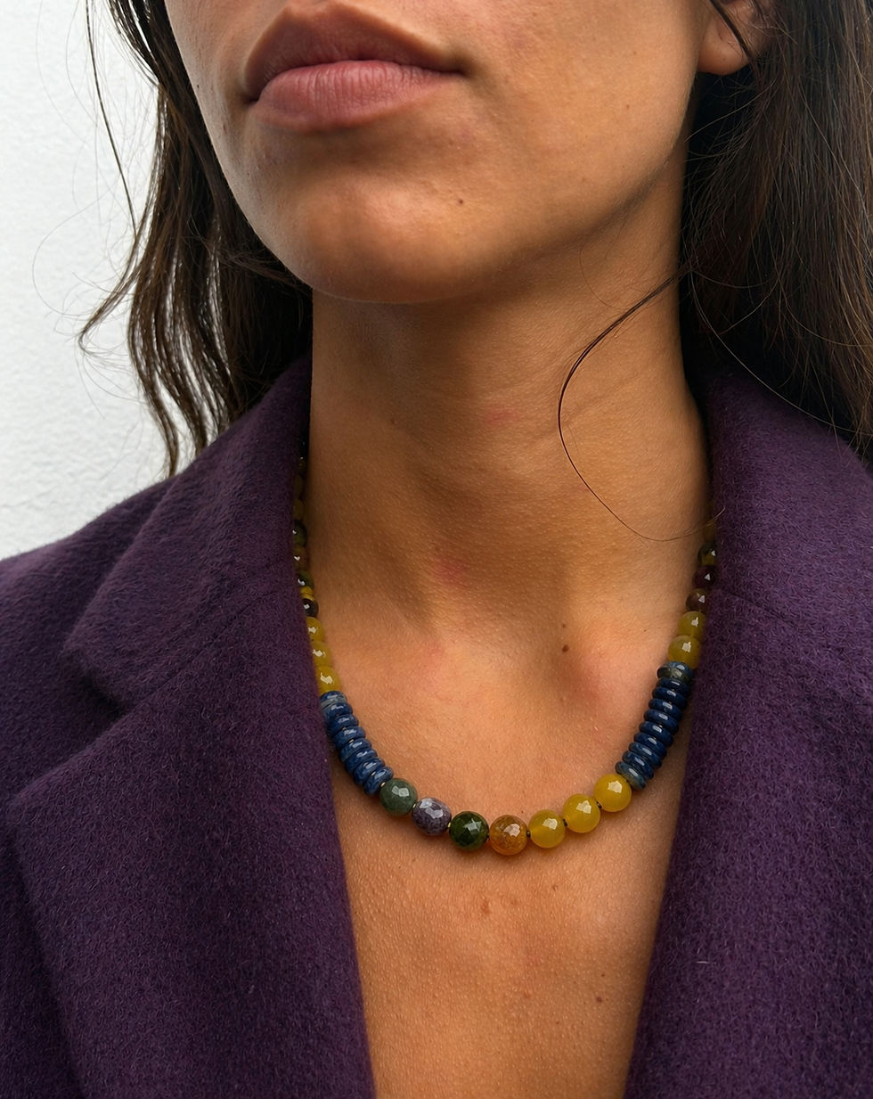 Collar de cuentas esféricas en vidrio de acabado pulido, con brillo intenso y color vibrante. Un clásico versátil que suma fuerza y elegancia a cualquier look.